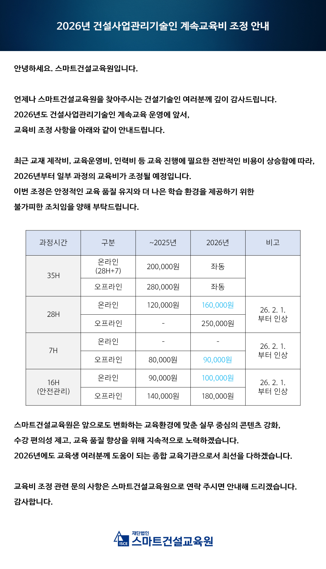 2026년 건설사업관리기술인 계속교육비 조정 안내